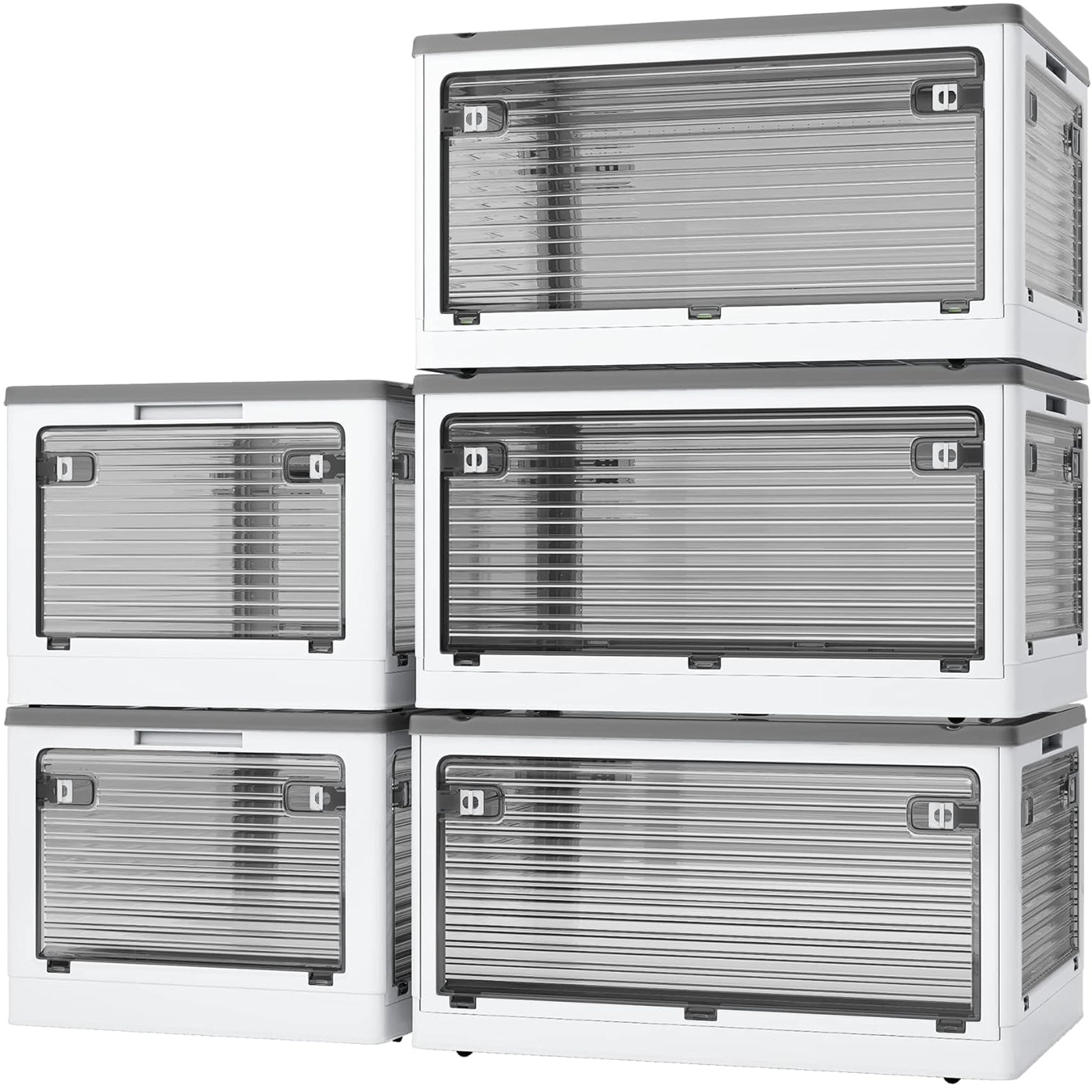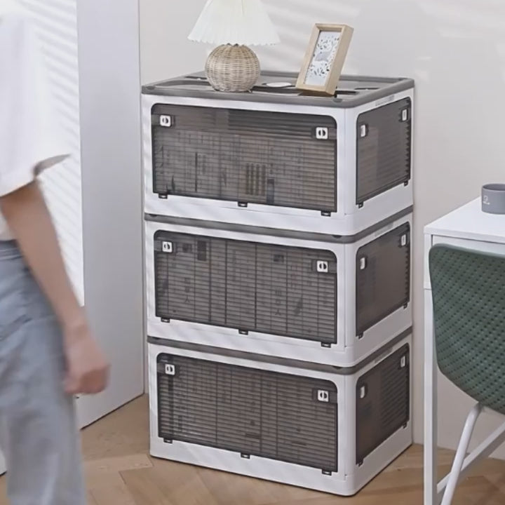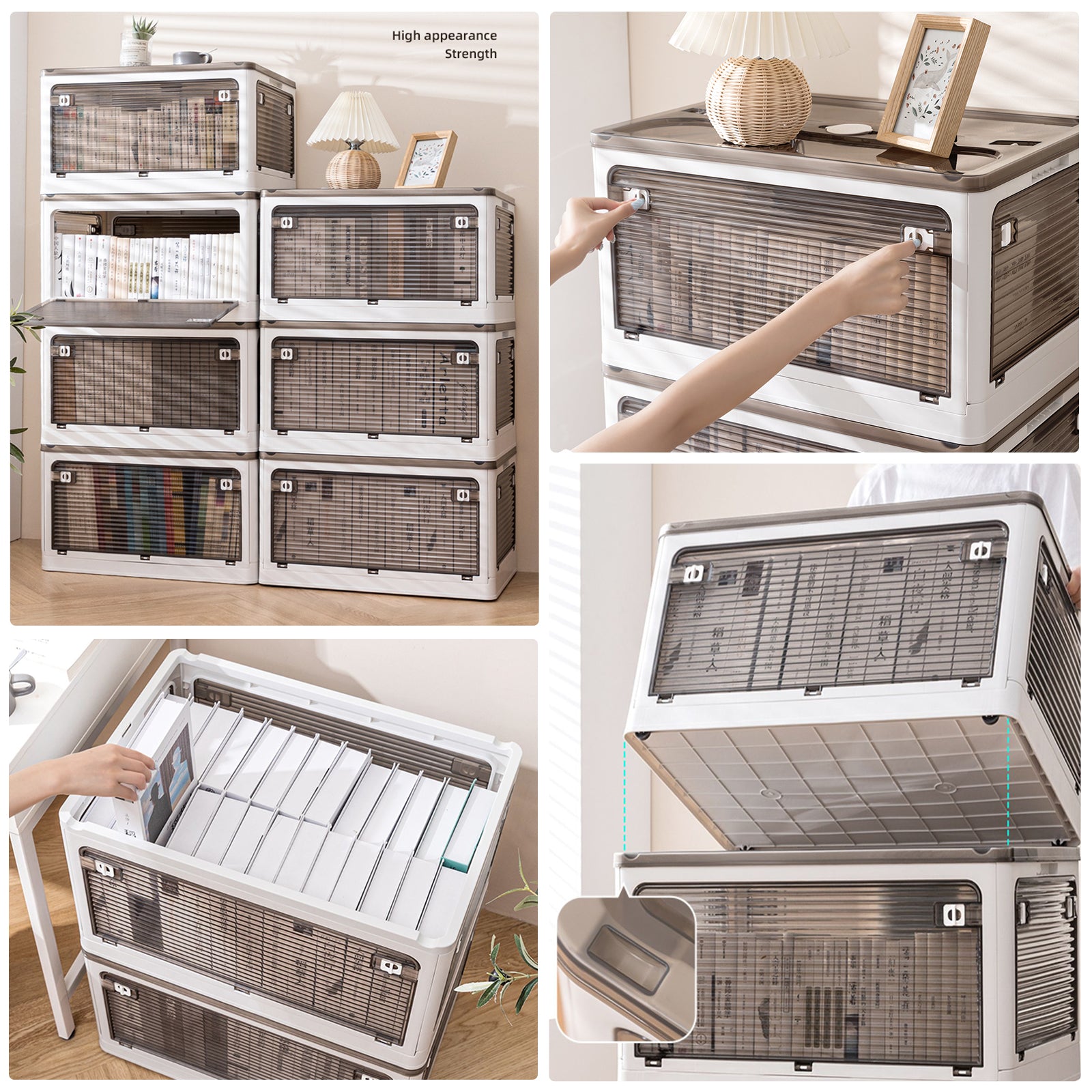 - 【折り畳み▪上に蓋/側面扉付き】収納箱界の大革新!使わない時に折りたたんで収納できます。スペースを取りません。側面四面も扉付き、収納にとても便利です。上にふた付き、物を入れやすい。蓋をロックできます。物を取るは側面扉から、ボックスを積み重ねる状態にも楽に物を取り出して、伝統的な収納ボックスに比べてもっと便利で、機能性が向上します。